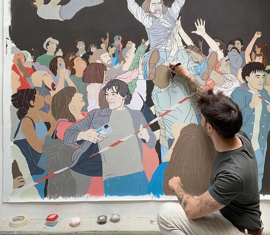 Dans ma quête d’une certaine épure, je me suis tourné vers l’aplat de couleur et vers la ligne. La figuration dépend alors juste de la précision d’un contour et non pas de l’ombrage comme pour la peinture figurative à l’huile par exemple. Cette manière m’est venue naturellement, inspiré par les peintres de la Figuration Narrative des années 80, Combas en tout premier lieu.